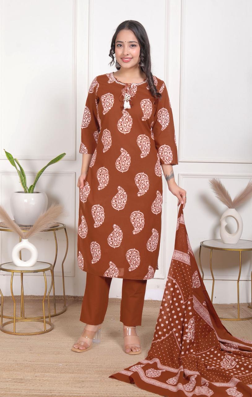 + Free ShippingElegant rust brown rayon kurta set featuring ethnic paisley print and tassel neckline. Comfortable 3-piece set ideal for office, daily and casual wear.