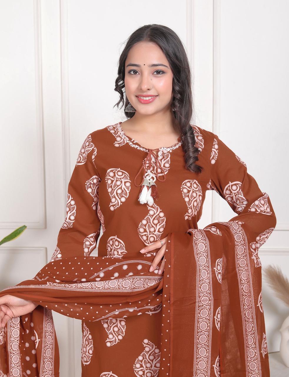 Rust Brown Rayon Printed Kurta Pant Set with Dupatta